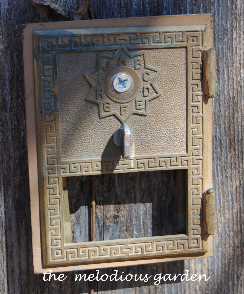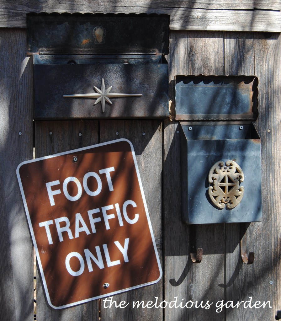 Quirky treasures about the garden, like an old mailbox cover getting a new life as a garden gate handle.