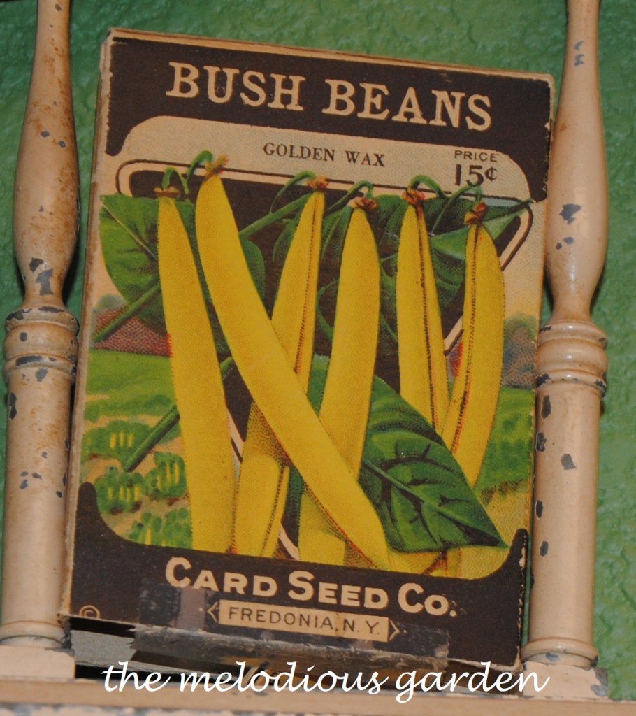 Old vegetable seed packets as kitchen decor.